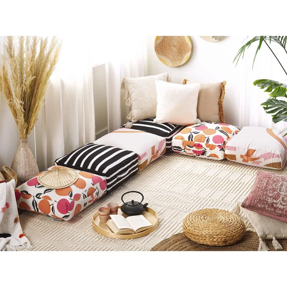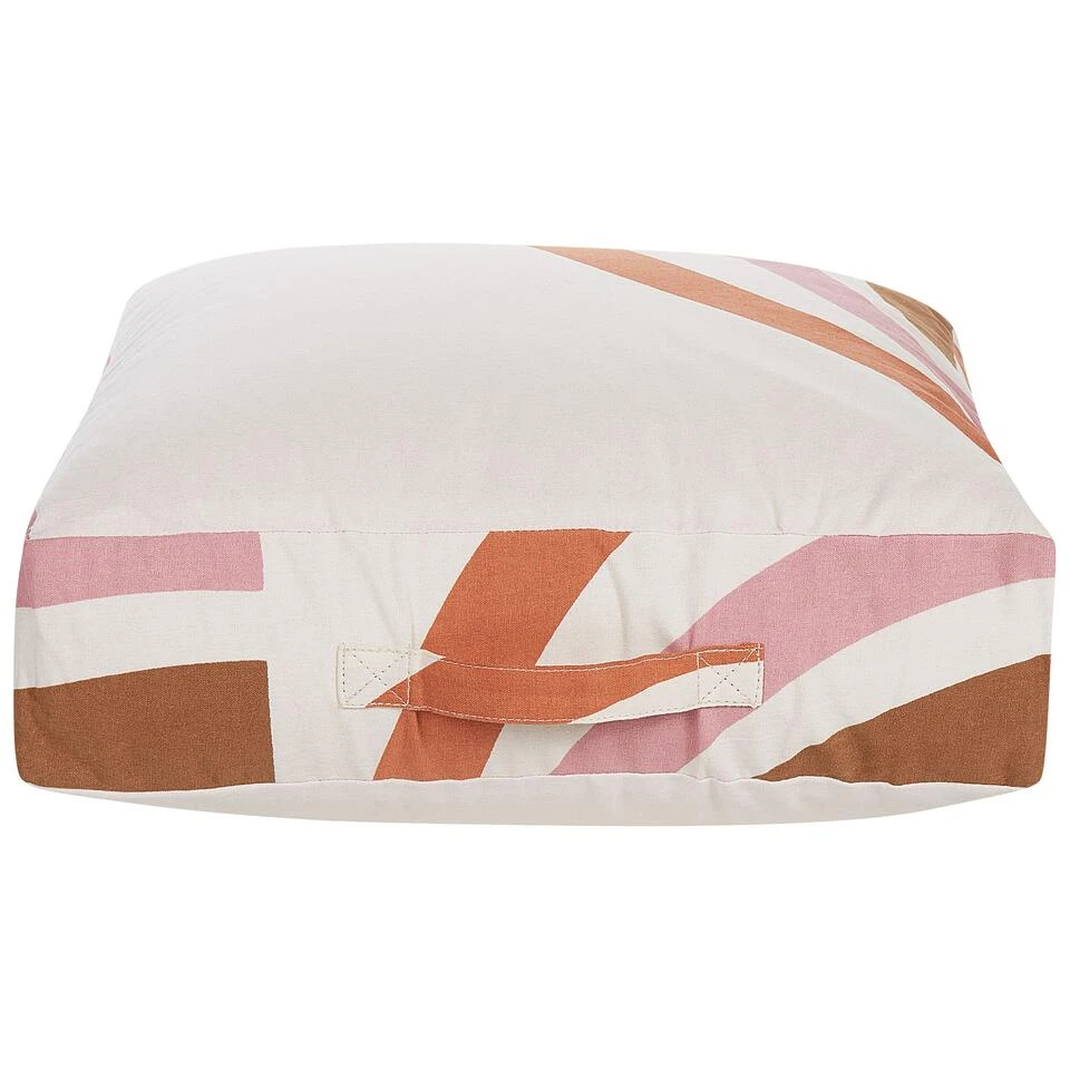 Kleurrijk zitkussen. Zorg voor kleur in je woonkamer met dit vloerkussen. Hij trekt de aandacht met zijn abstracte patroon en past in verschillende interieur stijlen thuis zoals bijvoorbeeld Boho of moderne stijlen. Het kussen is gemaakt van duurzaam katoen en heeft geen dagelijks onderhoud nodig. Het heeft een handige hendel waardoor je hem gemakkelijk kan verplaatsen.