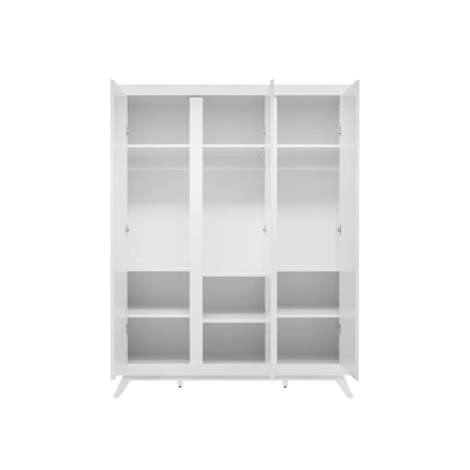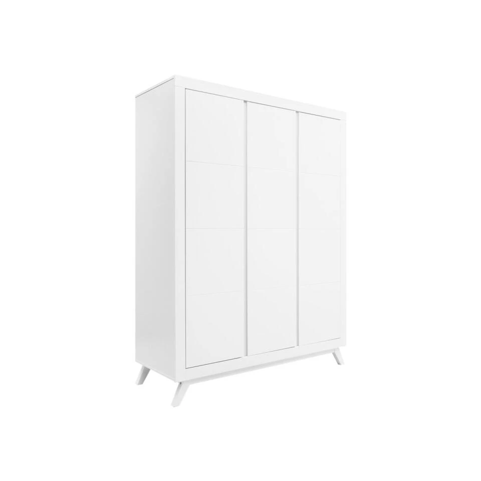 Deze zeer ruime kledingkast Anne van Bopita is geheel in wit uitgevoerd en staat op schuingeplaatste, taps toelopende poten. Hierdoor heeft deze garderobe een retro-look. De greeploze deuren zijn uit dik MDF vervaardigd en zijn voorzien van subtiele horizontale groeven. De gebruikte lak is op waterbasis, en daardoor veilig voor kinderen en milieuvriendelijk. Het hout van deze kast is afkomstig uit Europese bossen. Het interieur van deze garderobekast bestaat uit drie compartimenten en bevat drie vaste legplanken, zes in hoogte verstelbare legplanken en drie vaste hangroedes. Het is hierdoor mogelijk de kast naar eigen inzicht in te delen. Garderobekast Anne is goed te combineren met de andere meubels van dezelfde serie.