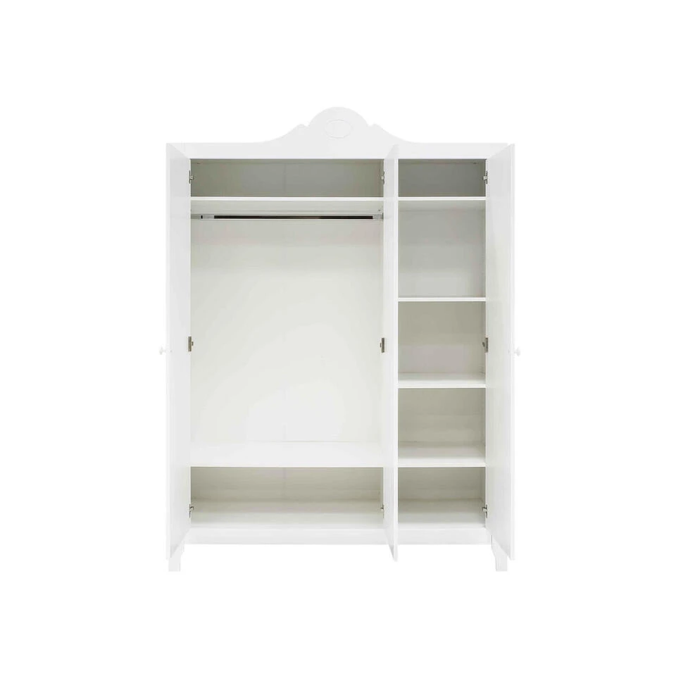 Deze hele ruime kledingkast Evi heeft een romantische, landelijke uitstraling door de sierlijke vormen en uitgefreesde groeven. De deuren zijn uit zwaar MDF vervaardigd en voorzien van gefreesde, afgeronde groeven. Door de softclose scharnieren sluiten de deuren zachtjes. De gebruikte lak is op waterbasis en daardoor veilig voor kinderen en milieuvriendelijk. Het hout van deze kast is afkomstig uit Europese bossen. Het interieur van deze kast bestaat uit twee compartimenten en bevat zes ruime in hoogte verstelbare legplanken en een in hoogte verstelbare hangroede. Het is daardoor mogelijk om de kast naar eigen wens in te delen. Combineer deze garderobekast Evi met de andere meubels van deze serie om een romantische, landelijke kamer te creëren.