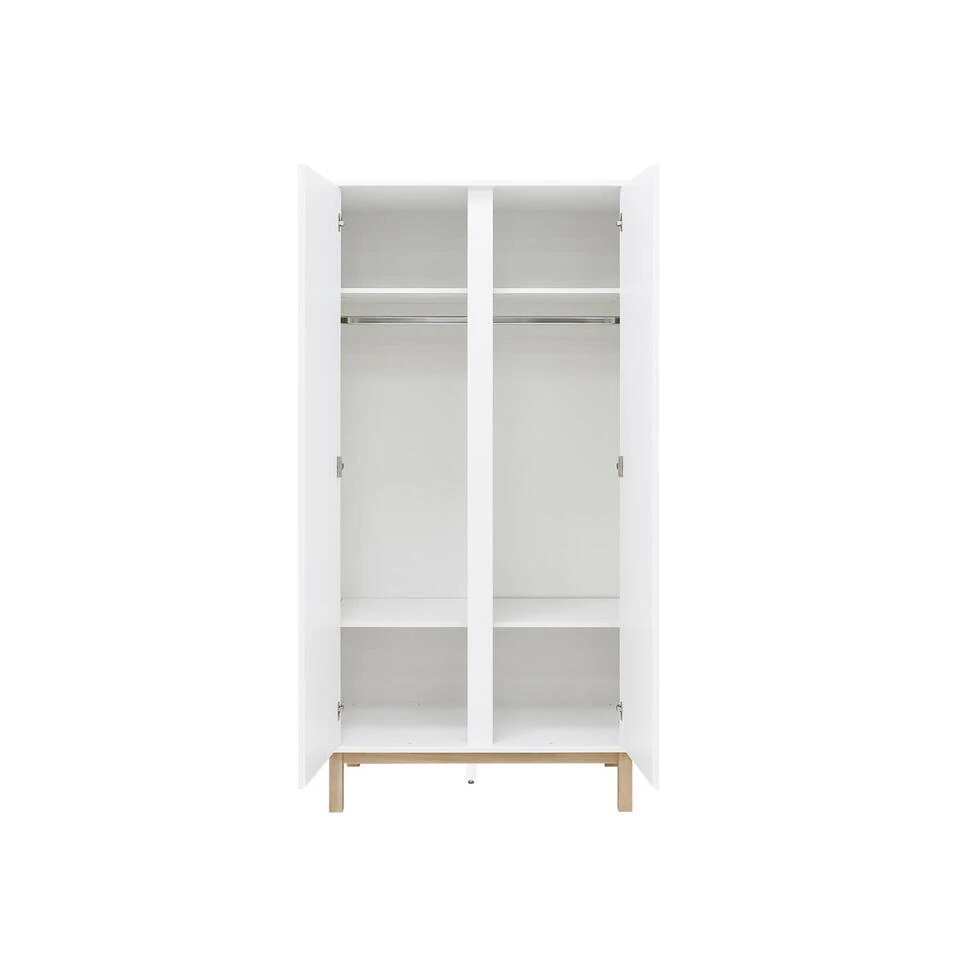 De afgeronde hoeken van deze kledingkast Mika, zorgen voor een luxe uitstraling! De kast staat op een mat afgewerkt eiken onderstel. De greeploze deuren zijn voorzien van subtiele horizontale groeven. Achter iedere deur bevindt zich een vaste legplank, een hangroede en een in hoogte verstelbare legplank. Genoeg plek dus om kleding in op te bergen. De kast is afgewerkt met een lak op waterbasis. Deze is kind- en milieuvriendelijk. Combineer deze kast met de andere meubels van de serie Mika.