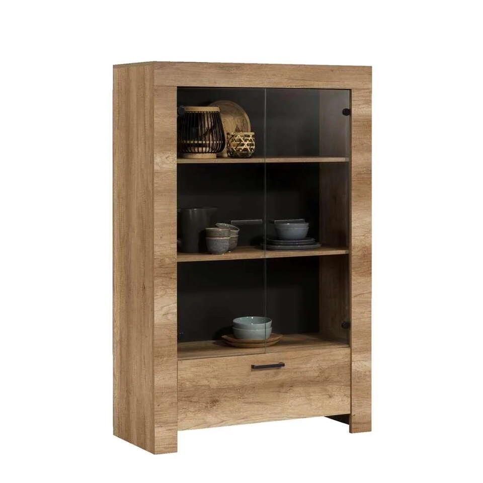 Buffetkast Lidia is een multifunctionele kast met twee glazen deuren en een ruime lades. In deze handige en veelzijdige kast heb je veel opbergruimte voor bijvoorbeeld serviesgoed. Ook voor leuke blikvangers en accessoires zoals fotolijstjes kun je kwijt in deze kast. De kast is stijlvol vormgegeven en heeft een landelijke look. Dankzij de elegante eikenkleur past deze kast in ieder interieur. Deze kast heeft een afmeting van 162x102x43 cm.