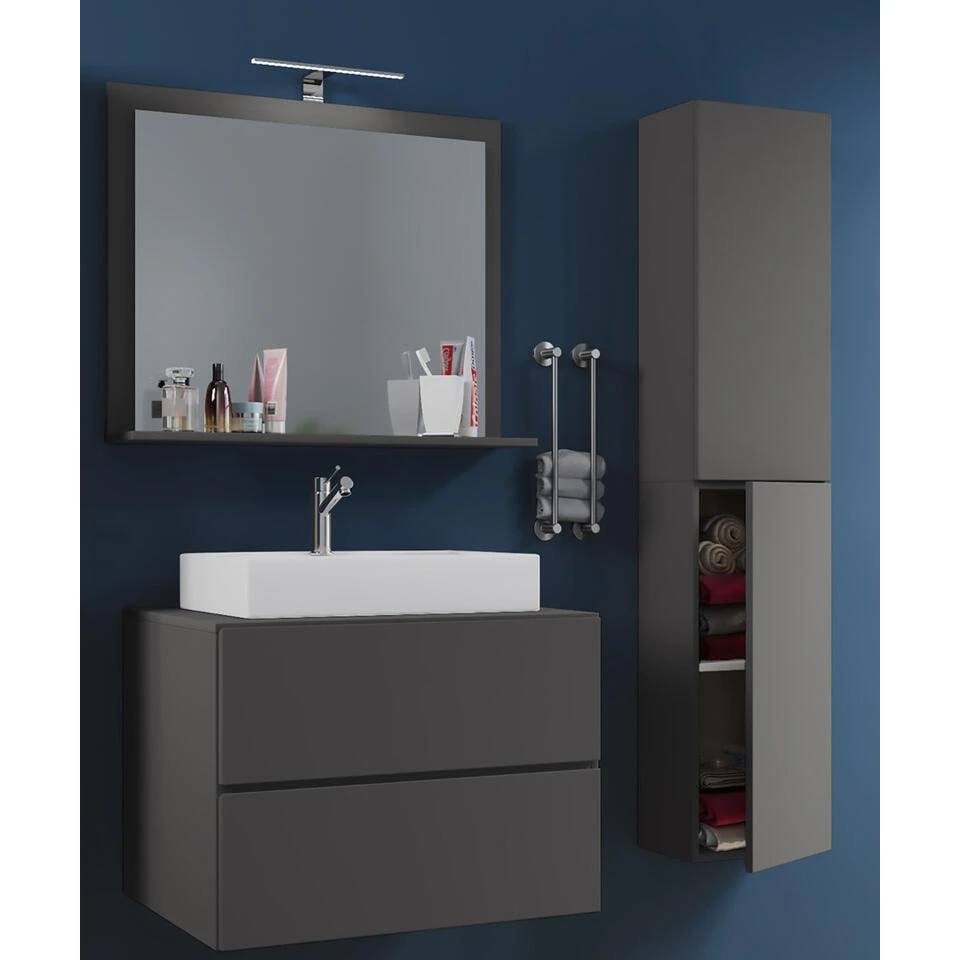 LendasL badkamer 60 cm, spiegel, antraciet. 1 badmeubel met wastafel zonder kraan, 2 laden, spiegel zonder licht, 1 hoog meubel, 2 deuren 60 cm. Interieur: 4 vakken, 2 laden. Spiegel: