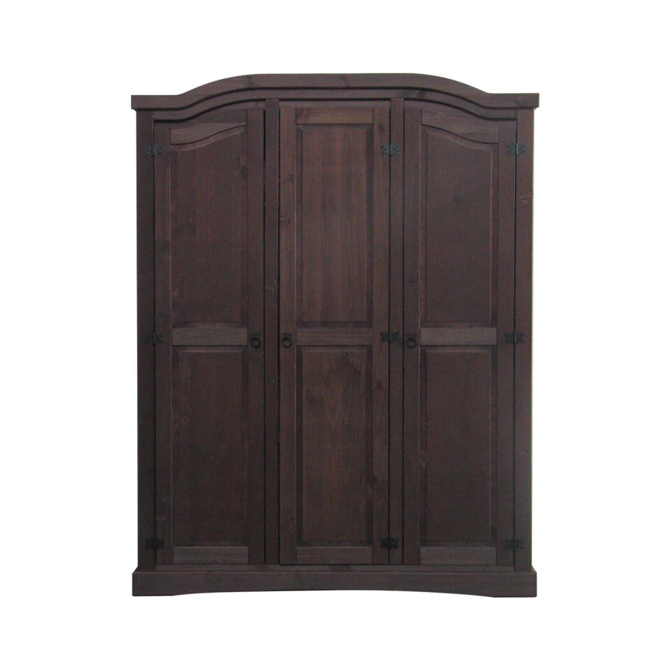 Bruine kledingkast 3-drs New Mexico, gebeitst en gewaxt, voorzien van het klassieke zwarte meubelbeslag in mexicaans grenen stijl. Een leuke bruine kledingkast van 152cm breed en 193cm hoog.