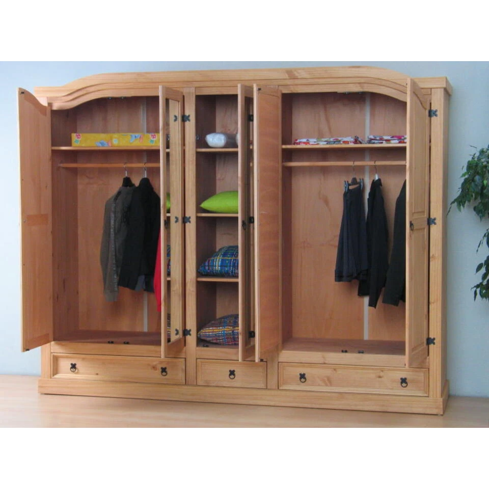 New Mexico 5-deurs kledingkast met spiegel. Geweldige ruime en sierlijke kledingkast van massief grenenhout, geloogd en gewaxt, met alle kenmerken die een echte houten kast zo’n aanvulling op je slaapkamer maken.