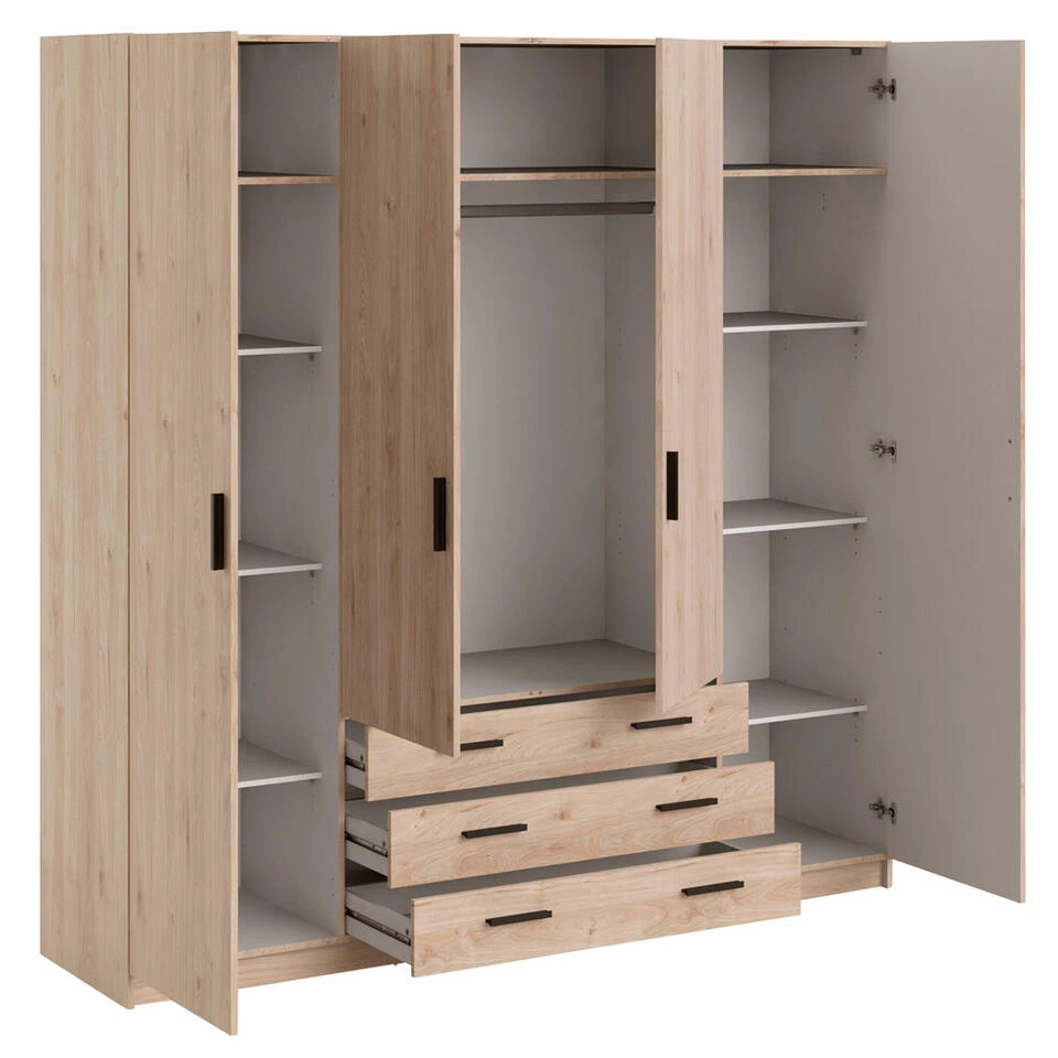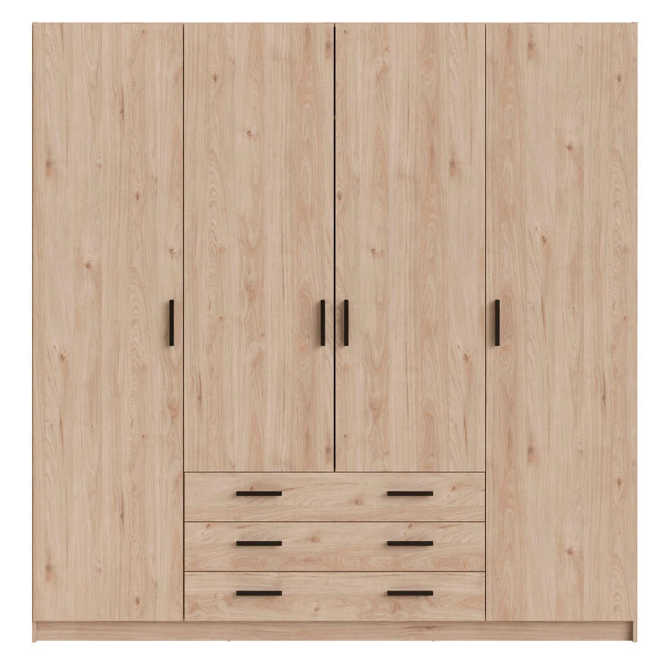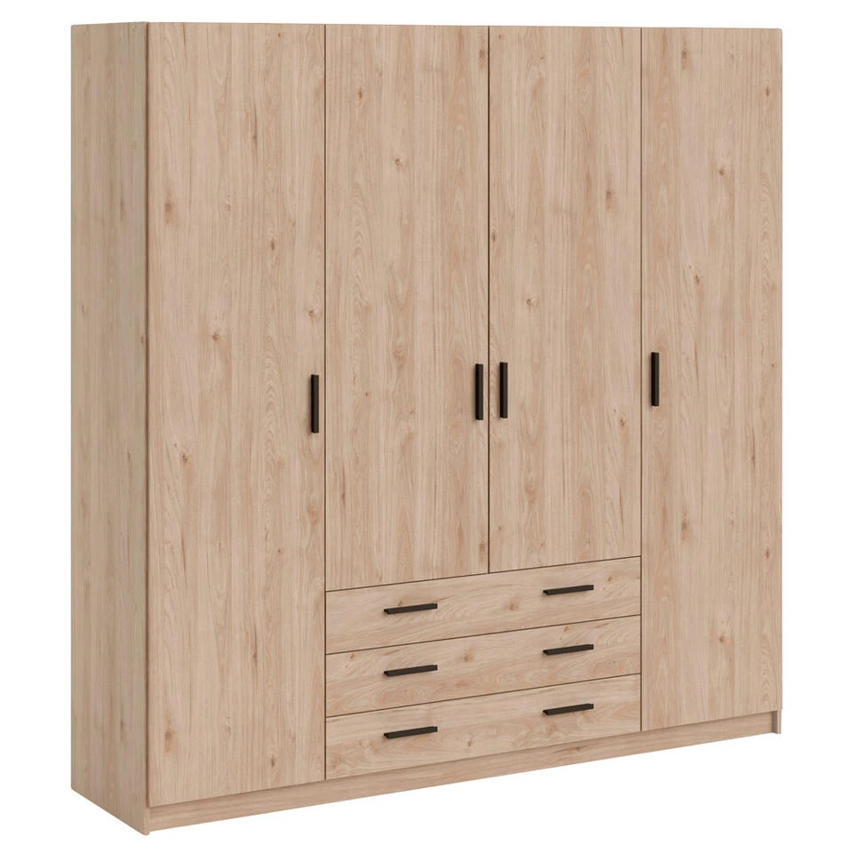 De 4-deurs kast heeft drie laden en een afmeting van 200x196x50 cm (hxbxd).