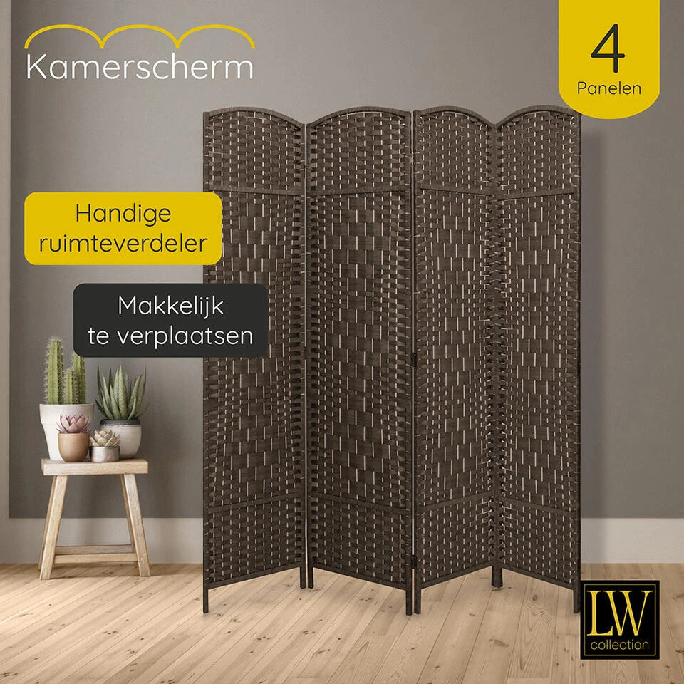 Scheidingswanden kunnen bijvoorbeeld ook gebruikt worden om een ruimte af te schermen. Ruimteverdelers worden ook wel gebruikt als decoratiestuk. LW Collection heeft een breed assortiment aan kamerschermen in uiteenlopende stijlen, materialen en kleuren. Kamerschermen of paravent van LW Collection worden gemaakt van hoogwaardige materialen om zo de hoogste kwaliteit te kunnen waarborgen.