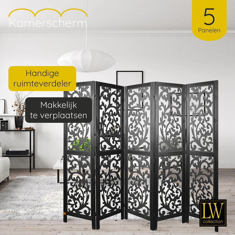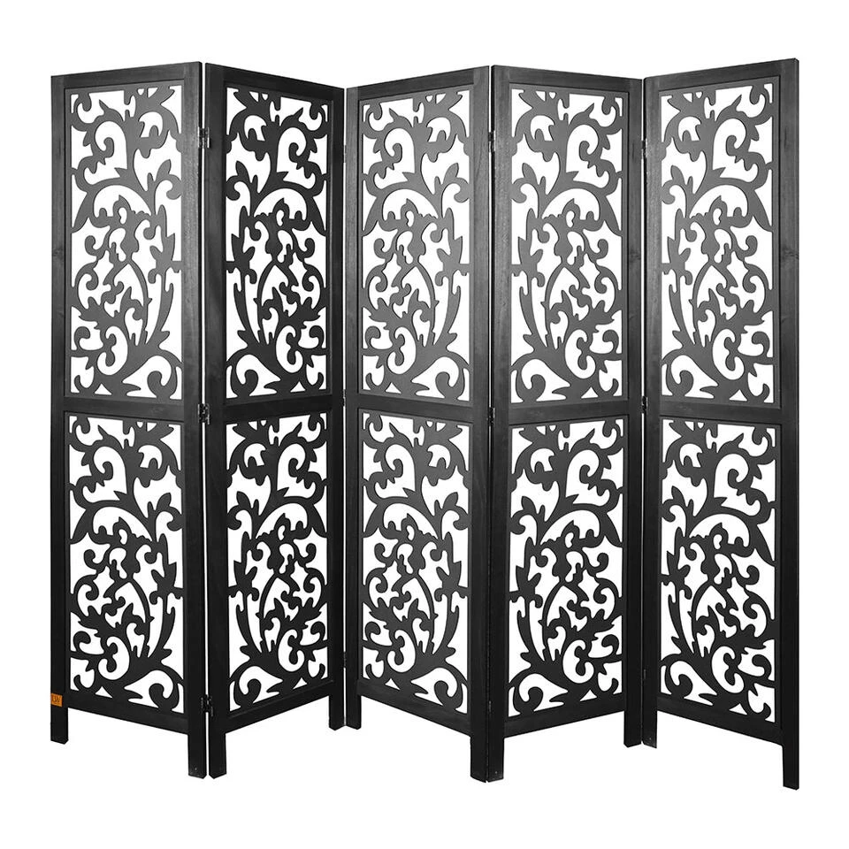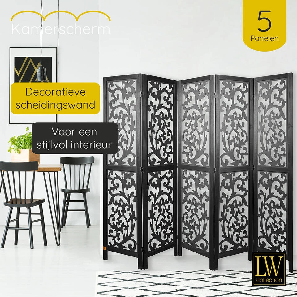 Dit decoratieve kamerscherm met 5 panelen van hout in de kleur zwart heeft een afmeting van 170×200 cm en past goed bij ieder interieur in huis of op uw werkplek.