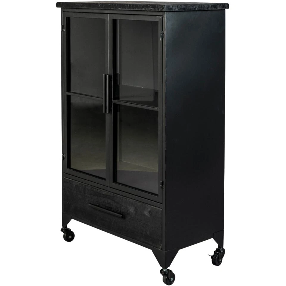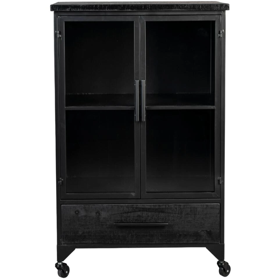 Kast Skåre van het woonmerk Puur is een stoer ontwerp met een afmeting van B65xD35xH105 cm. De combinatie van het metaal, wat is afgewerkt met zwartkleurige poedercoat, met het hout van de bovenzijde geeft een gave industriële draai aan ieder interieur. Dit ontwerp biedt twee hoge deurtjes met glazen panelen, waarachter items netjes en sfeervol kunnen worden opgeborgen. De diepte van de kast telt 35 centimeter, waardoor er binnenin lekker veel ruimte is. Daarnaast bevindt zich onder de deuren een lade, waarin nog meer spullen kunnen worden bewaard. Dankzij de wieltjes kan kast Skåre gemakkelijk een ander plekje in huis worden gegeven. Wissel bijvoorbeeld eens af met de woonkamer en eetruimte! Voor een mooi geheel kan worden gecombineerd met de andere Skåre-items. Maximaal draaggewicht: 15 kg.