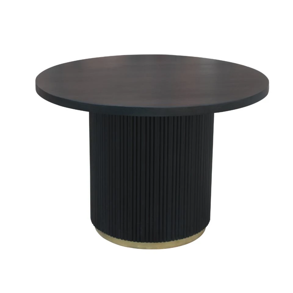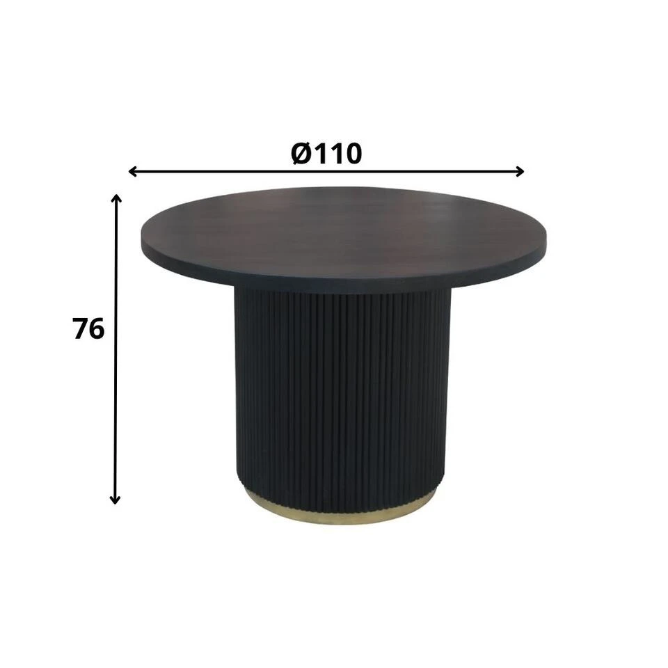 Ronde eettafel Elora is een ware eyecatcher in jouw interieur. Een modern en stijlvol design met een zachte uitstraling door de ronde vorm. De eettafel is gemaakt van mangohout en afgewerkt met een zwarte laklaag. Een duurzaam product met een mooie afwerking. De voet van de tafel is bekleed met verticale houten latten die voor een uniek effect zorgen. Onderaan de voet zit een messing rand. De ronde poot is een prachtige toevoeging aan het design van de tafel. Het zorgt voor stabiliteit en stevigheid. De moderne stijlvolle uitstraling van de tafel maakt het gemakkelijk te combineren met verschillende interieurstijlen, van modern tot klassiek. De tafel meet 110 cm in diameter, waardoor er voldoende ruimte is voor 4 personen. Of je nu gezellig met je gezin eet of gasten ontvangt, deze tafel biedt voldoende plaats. Bovendien is de ronde vorm ideaal om het gesprek gaande te houden en het dineren of borrelen extra gezellig te maken.