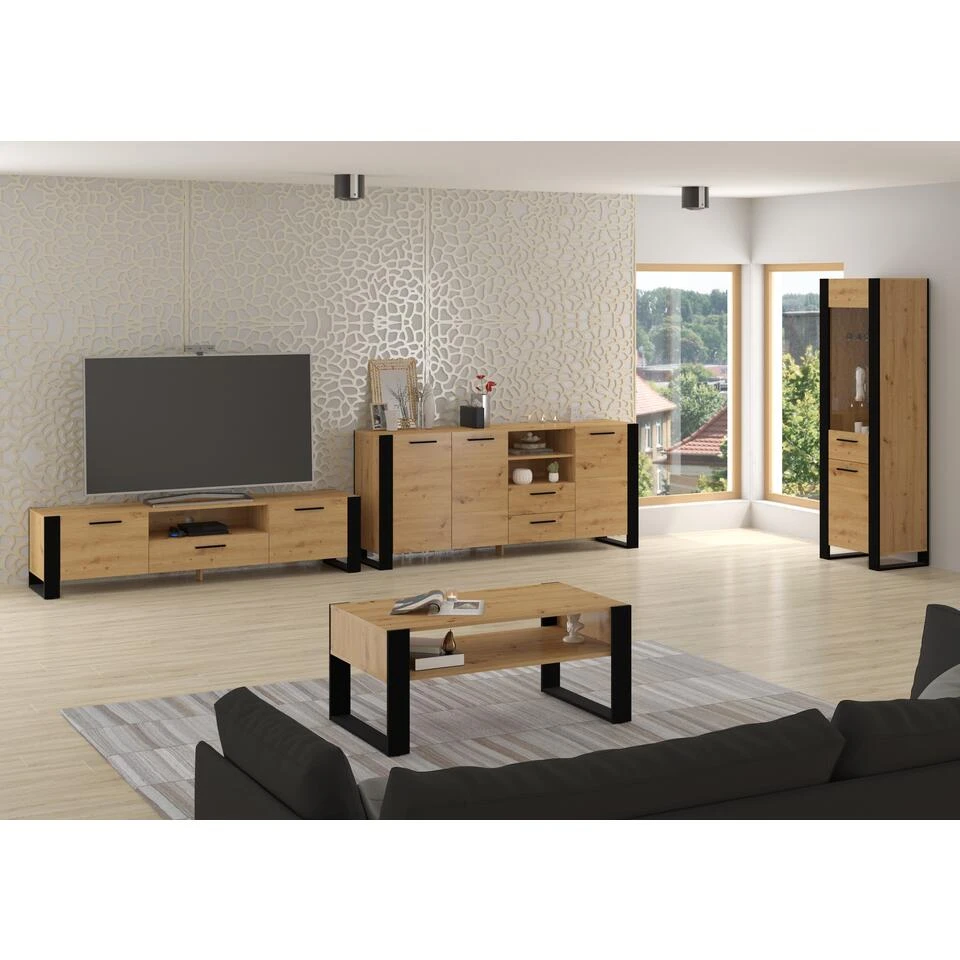 Extreem elegante en stijlvolle salontafel voor de woonkamer uitgevoerd in modieuze en natuurlijke kleuren. Hij kenmerkt zich door een moderne en oogstrelende uitstraling – zijn charme wordt bepaald door grote zwarte poten in framevorm, die mooi contrasteren met de rest van het meubilair De bank heeft een extra plank