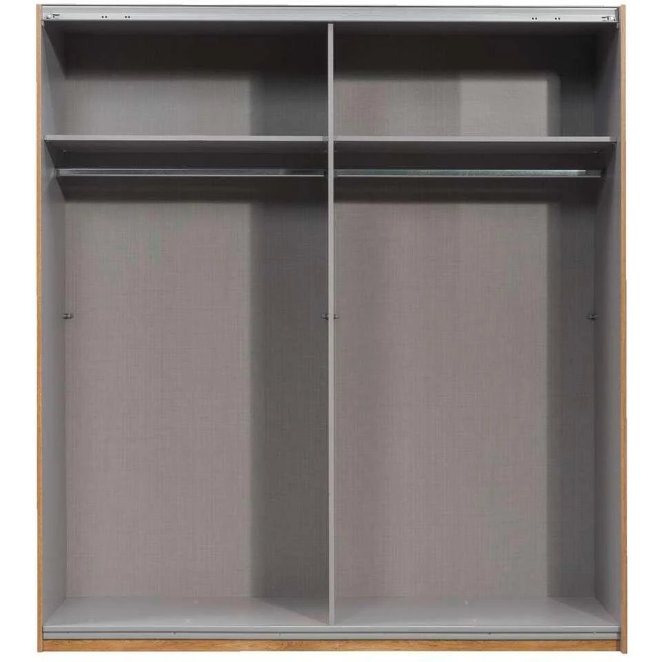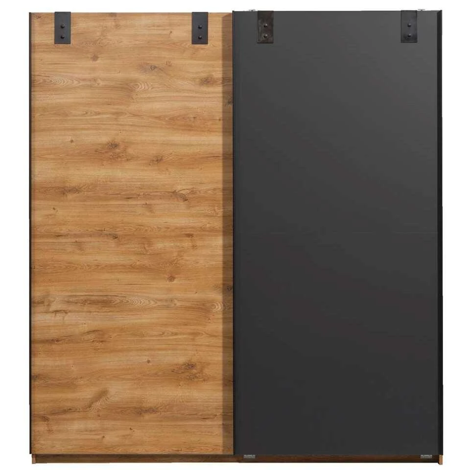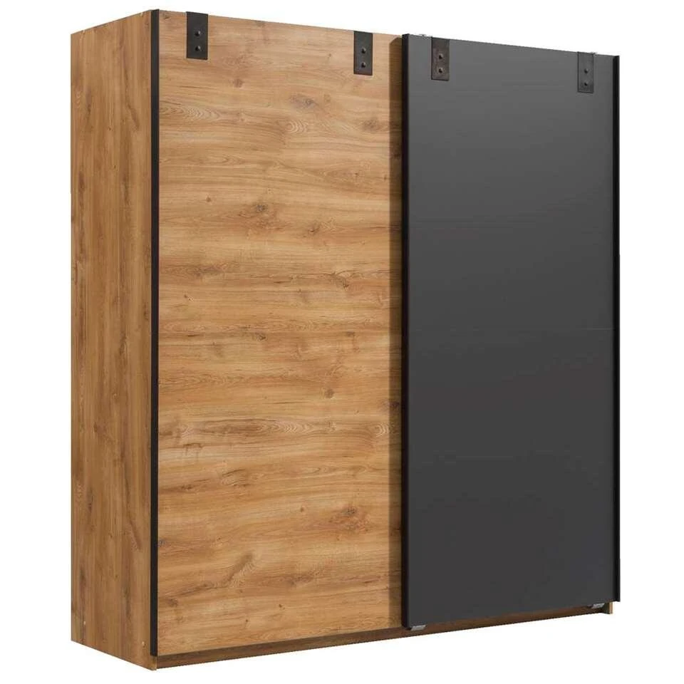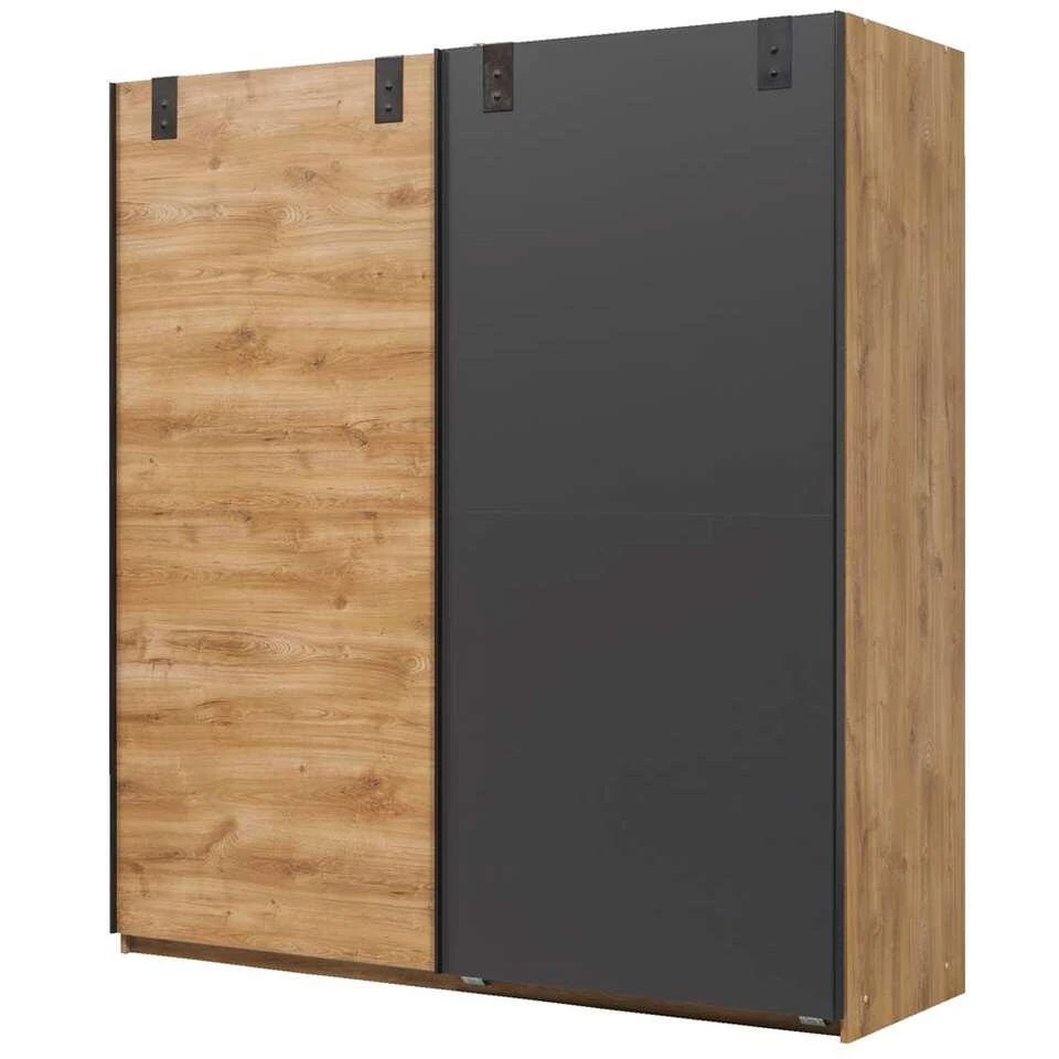 Schuifdeurkast Dex is een grote linnenkast, gemaakt van spaanplaat. De kast is uitgevoerd in eikenkleur/grafiet en heeft twee schuifdeuren. Eén deur heeft de eikenkleur, de andere deur heeft de grafietkleur. Deze kast is niet alleen functioneel, maar ook nog eens bijzonder leuk om te zien. De linnenkast wordt geleverd met 2 legplanken en roedes. Zo heb jij genoeg ruimte voor het het leggen en hangen van kleding.
