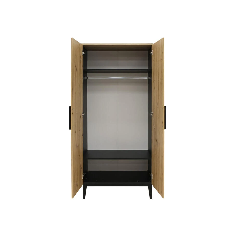 De garderobekast Xem heeft een stoere uitstraling door de mat zwarte afwerking in combinatie met de eiken look. De kast staat op ranke taps toelopende poten. De deuren hebben zwarte handgrepen en zijn voorzien van een softclose mechanisme. Hierdoor sluiten de deuren zachtjes. Het interieur van deze kast bevat een vaste legplank, een ruime in hoogte verstelbare legplank en een in hoogte verstelbare hangroede. Het hout van deze kast is afkomstig uit Europese bossen. Deze kledingkast Xem is goed te combineren met de andere meubels van dezelfde serie.