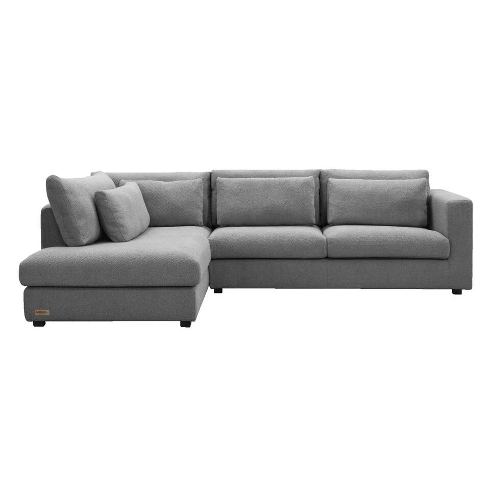 Deze bank is bekleed met meubelstof Aral in de kleur grijs.