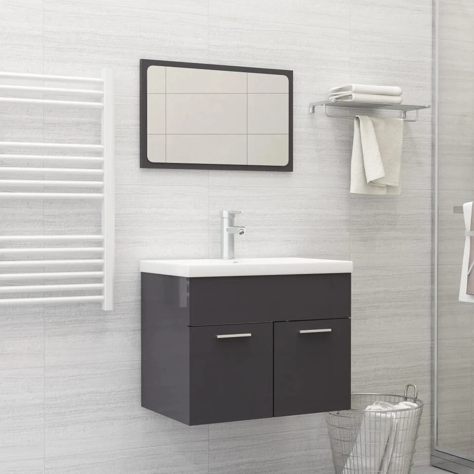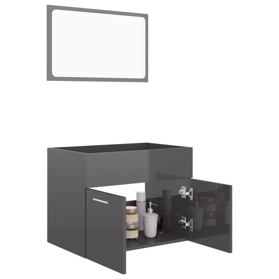 De meubelset, bestaande uit een spiegel en een kast, is gemaakt van duurzaam en stabiel spaanplaat. De chique kast is voorzien van 1 vak en 2 deuren en biedt voldoende opbergruimte om spullen in je badkamer op te bergen. Het blad van de kast is ideaal voor het plaatsen van een wastafel. De spiegel geeft je interieur een prachtige uitstraling. Deze badkamerset is gemakkelijk schoon te maken met een vochtige doek.