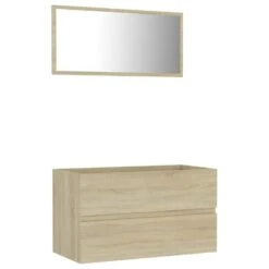 De meubelset, bestaande uit een spiegel en een kast, is gemaakt van duurzaam en stabiel spaanplaat. De chique kast is voorzien van 1 lade en biedt voldoende opbergruimte om spullen in je badkamer op te bergen. Het blad van de kast is ideaal voor het plaatsen van een wastafel. De spiegel geeft je interieur een prachtige uitstraling. Deze badkamerset is gemakkelijk schoon te maken met een vochtige doek.