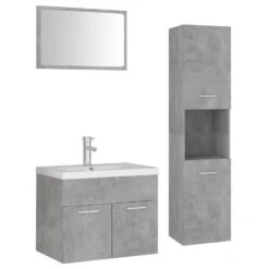 De meubelset bestaat uit een wastafelkast, een hoge kast, een inbouwwastafel en een spiegel. De chique wastafelkast heeft 1 vak en het blad is perfect voor het plaatsen van je wastafel. De hoge kast heeft in totaal 5 vakken en 2 deuren, waardoor er voldoende ruimte is om spullen in je badkamer op te bergen. De wastafel is gemaakt van keramiek en dient niet alleen als product voor dagelijks gebruik, maar ook als versiering in je leefruimte. Dankzij zijn trendy en eigentijdse ontwerp past deze wastafel beslist in elk interieur. De overloop zorgt ervoor dat de bak nooit kan overlopen. De spiegel geeft je interieur een prachtige uitstraling. Deze badkamerset is gemakkelijk schoon te maken met een vochtige doek.