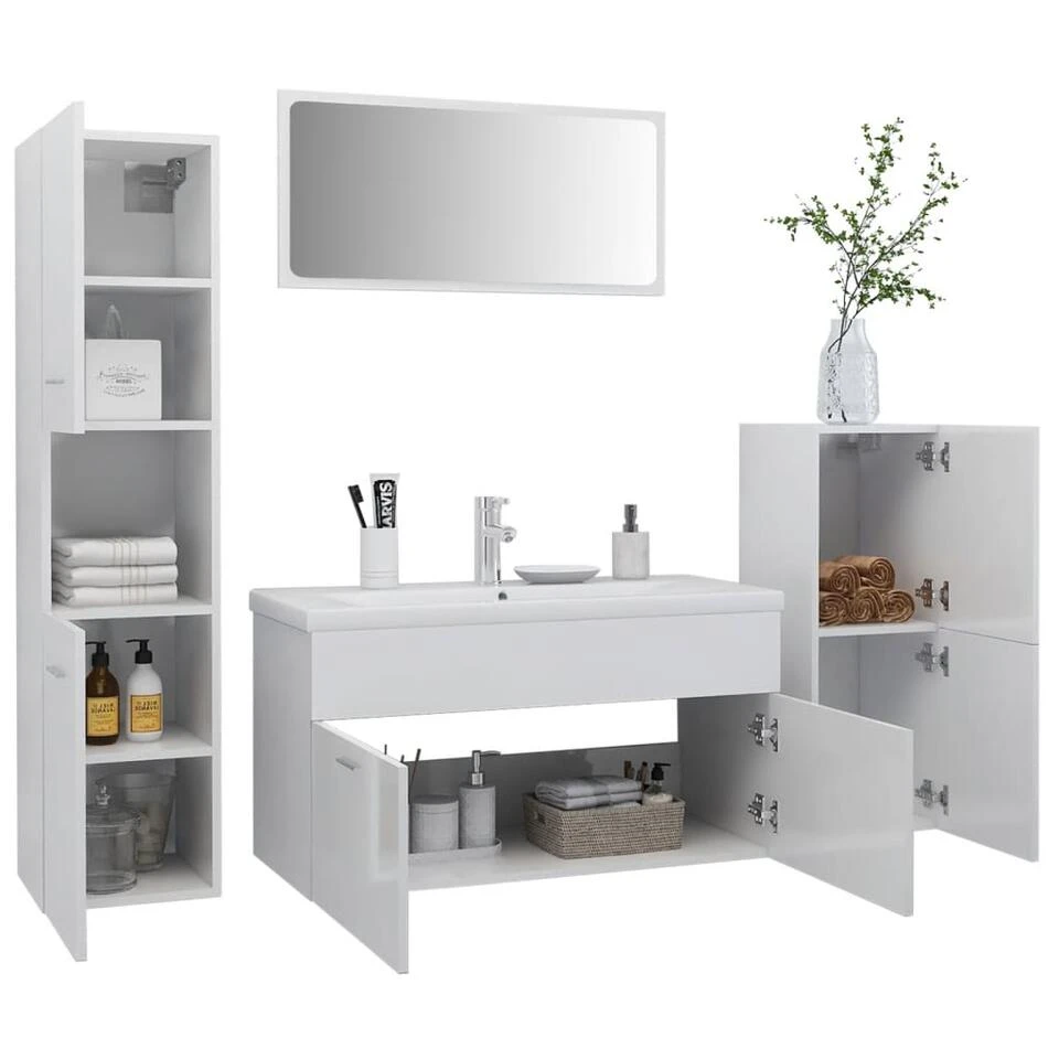 De meubelset bestaat uit een wastafelkast, een lage kast, een hoge kast en een spiegel. De chique wastafelkast heeft 1 vak en het bovenblad daarvan is ideaal voor het plaatsen van de wastafel. De hoge kast heeft in totaal 5 vakken en 2 deuren, terwijl de lage kast 2 vakken heeft. Deze 2 kasten bieden verschillende opbergmogelijkheden en extra ruimte om spullen in je badkamer op te bergen. De spiegel geeft je interieur een prachtige uitstraling. Deze badkamerset is gemakkelijk schoon te maken met een vochtige doek.