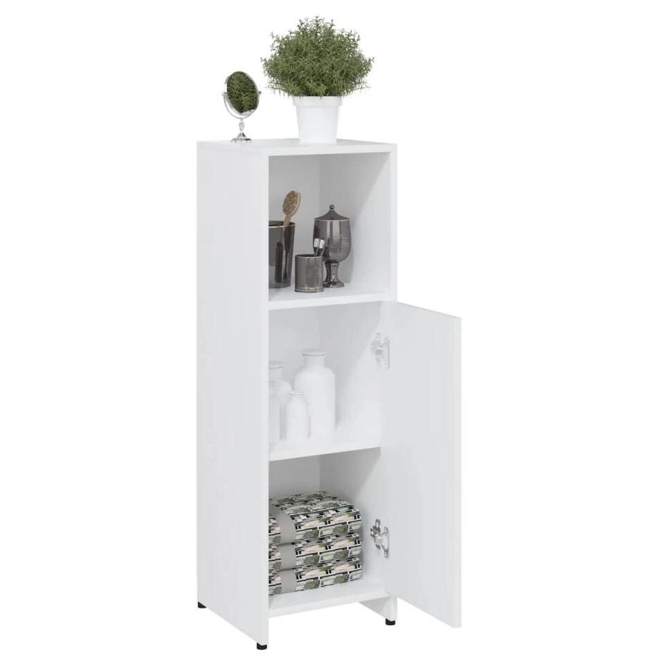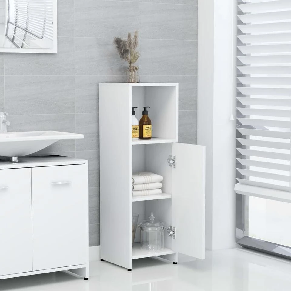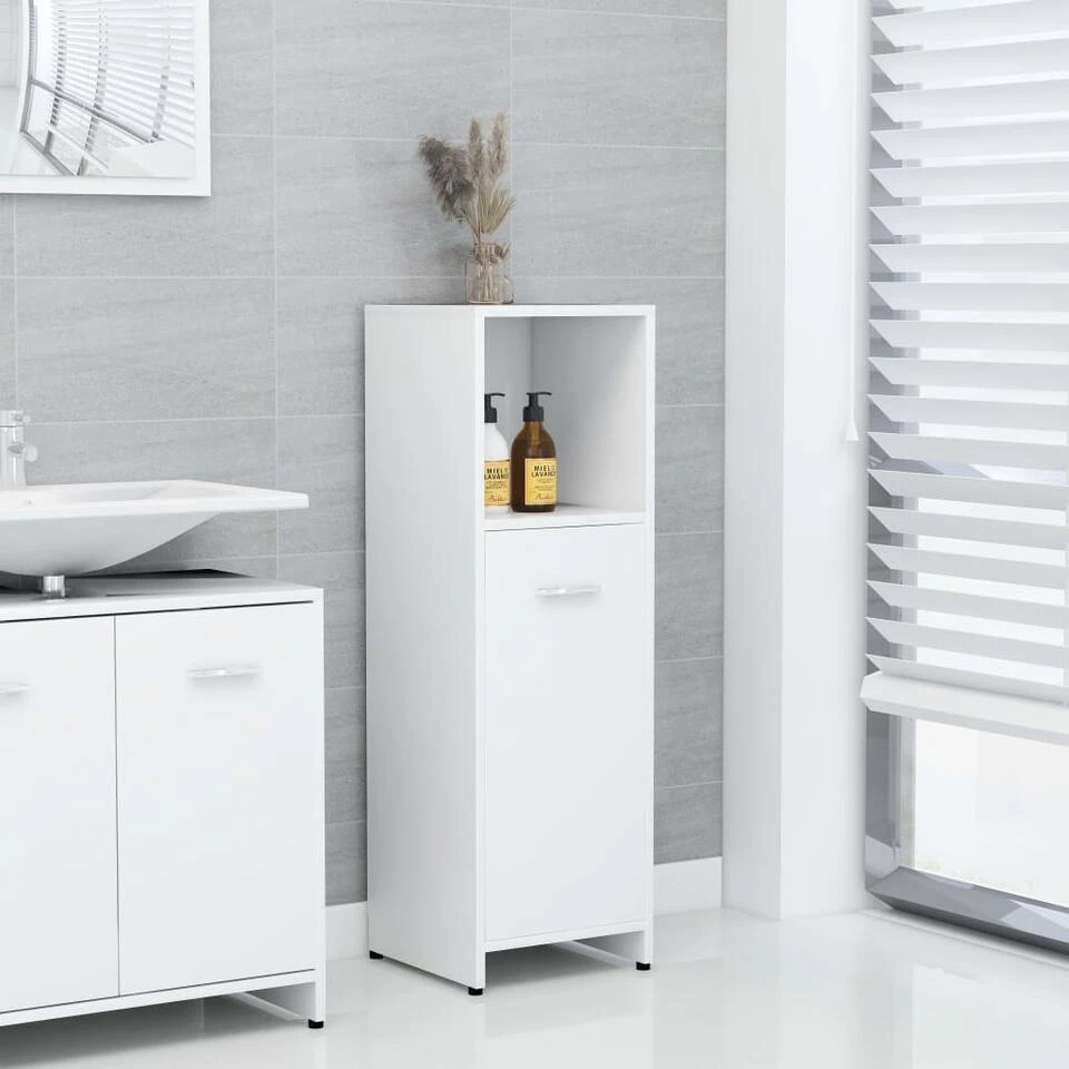 Deze chique kast is gemaakt van bewerkt hout, waardoor hij stevig en stabiel is. Voldoende opbergruimte: de badkamerkast heeft 3 vakken en 1 deur, waardoor je verschillende opbergopties en extra ruimte hebt om dingen in je badkamer op te bergen. De deur heeft een handgreep voor gemakkelijk openen en sluiten. De kast is eenvoudig schoon te maken met een vochtige doek.