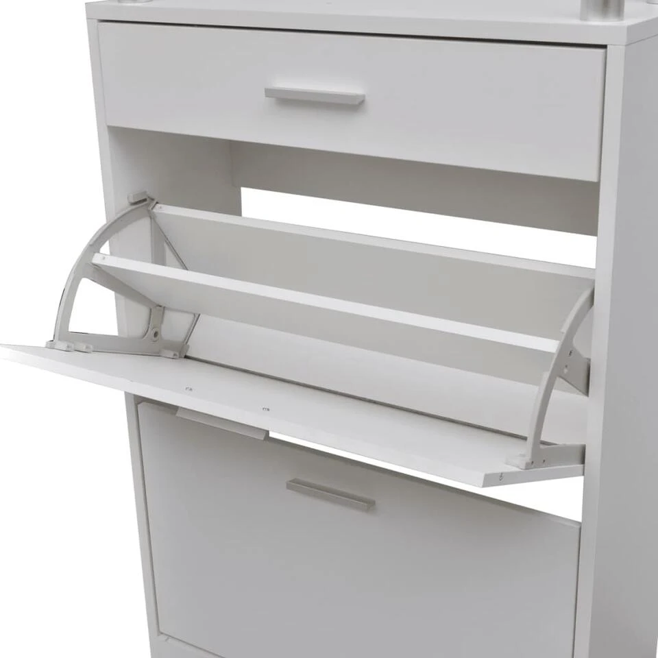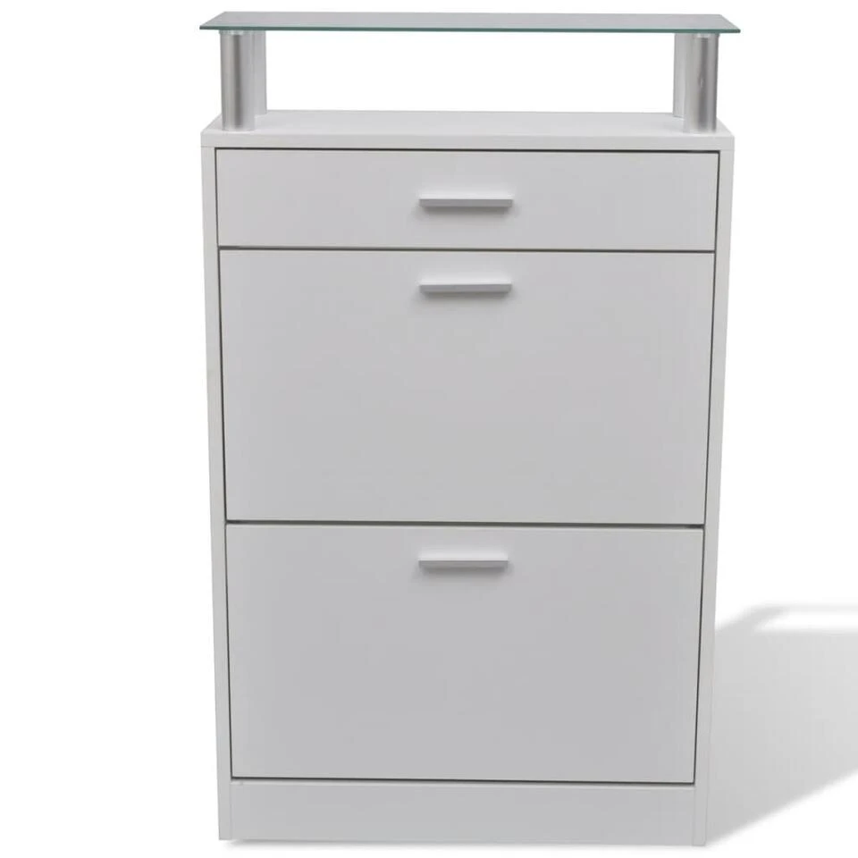 Deze houten schoenenkast heeft een lade, een glazen schap en 2 opslagvakken in een simpel en stijlvol ontwerp. U zal niet langer geërgerd zijn door rondslingerende schoenen.