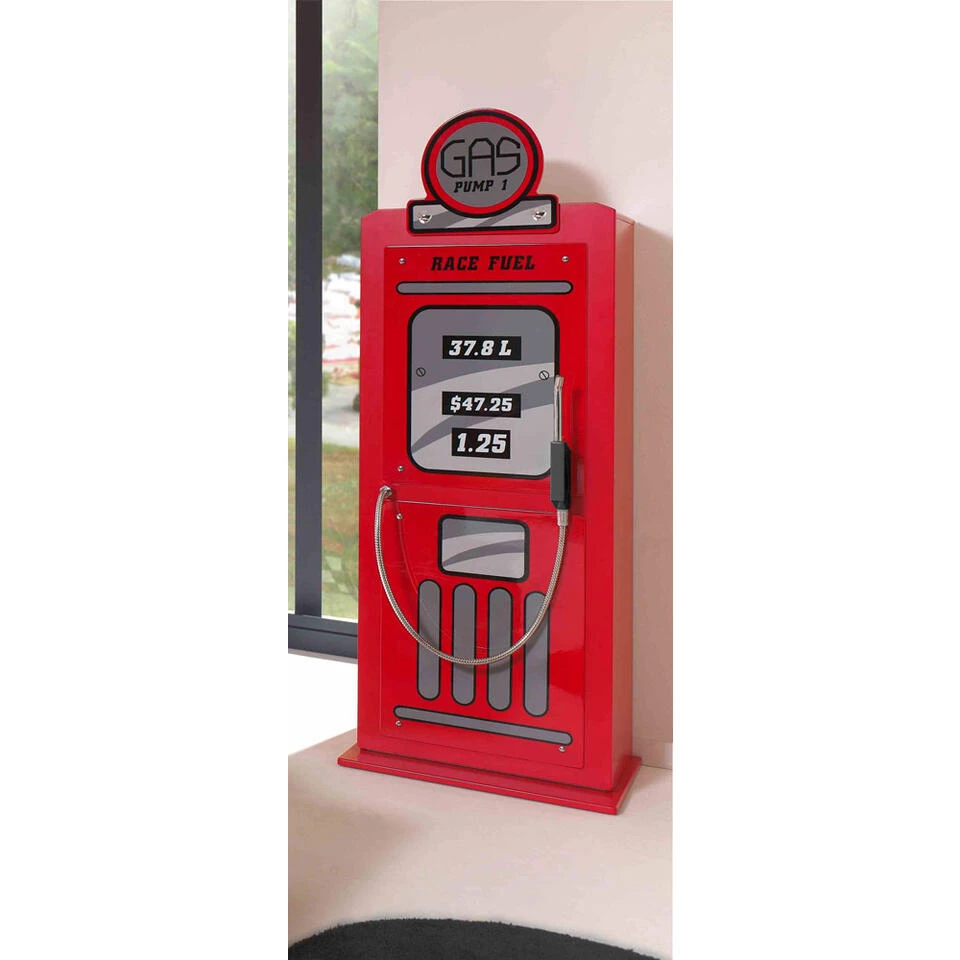 Deze Benzinepomp kast is ontworpen met oog voor detail. De kinderkamerkast is voorzien van een metalen slang waarmee je kunt tanken. Het tankstation is rood gelakt met verschillende grijstinten. Aan alles is gedacht. Bijvoorbeeld de prijs per liter en de totaalprijs van de tankbeurt. De kast beschikt binnenin over legplanken. De kast is bovendien combineerbaar met ieder willekeurig autobed. De ideale kast voor de kleine race-coureur en een musthave voor een kinderkamer met autoracen als thema!